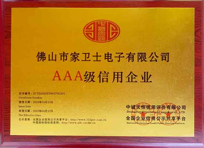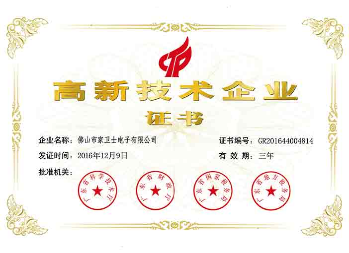 自成立以来,家卫士在不断发展,相继推出一系列功能齐全、科技含量高的产品,并荣获“广东省守合同重信用企业”、“安全生产标准化三级企业”、“三星品牌认证”、“ISO9001认证”、“ISO14000认证”、“RoSH认证”、“ CE认证”等证书。公司拥有超过十余年的自主研发基地、全自动化生产线及完整的品质监控检测系统。此外,公司还拥有楼宇对讲2项发明专利和8项实用型专利,指纹锁4项外观设计专利和7项新型实用专利,被评为“高新技术企业”。