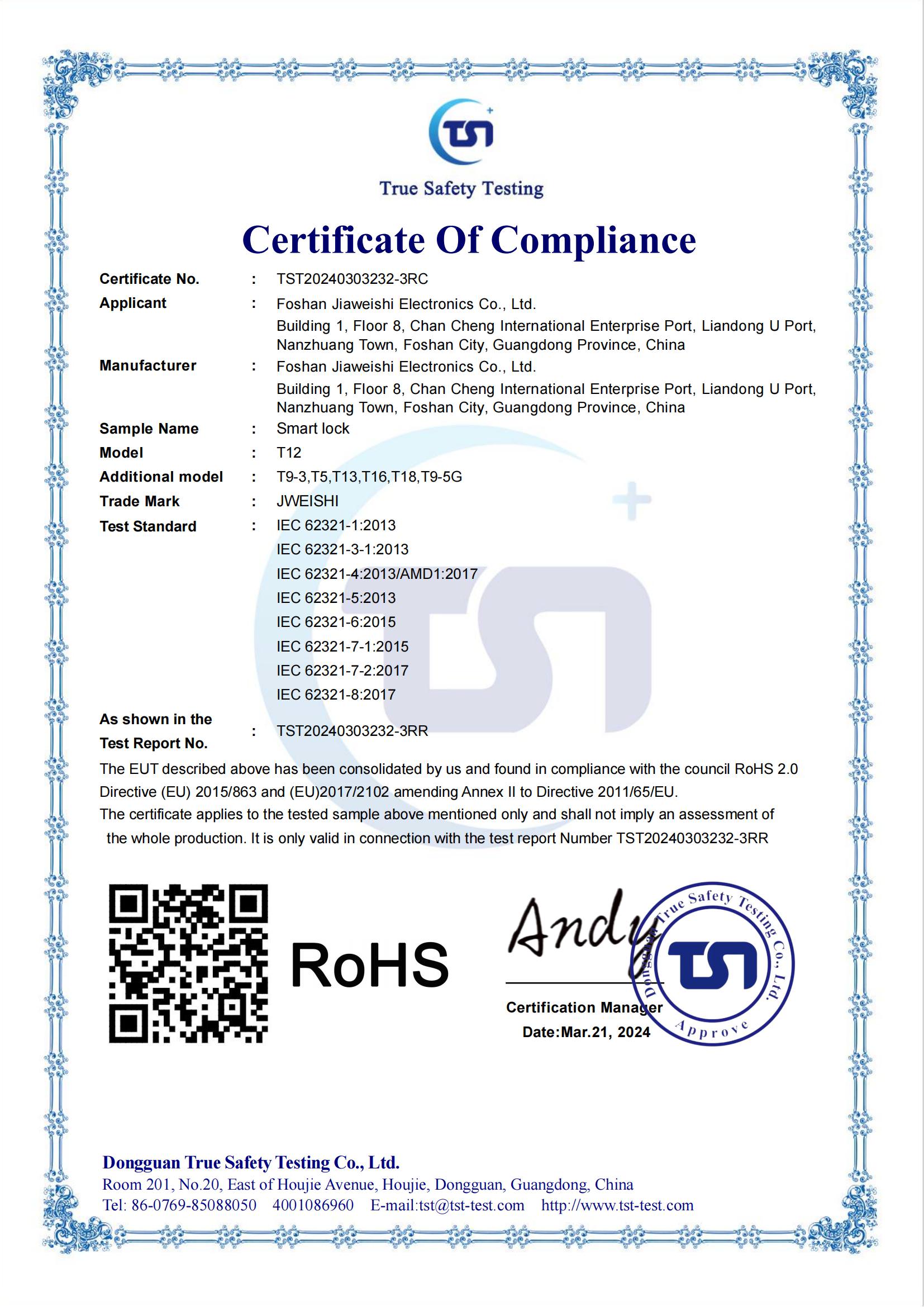 RoHS指纹锁认证